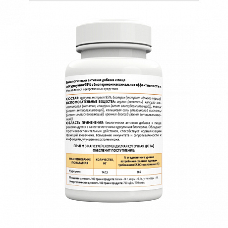 куркумы экстракт 95%, биоперин (экстракт чёрного перца). Вспомогательные вещества: инулин (носитель), капсула желатиновая (желатин, глицерин (агент влагоудерживающий)), тальк(агент антислеживающий), кальциевая соль стеариновой кислоты (агент антислеживающий), кремния диоксид (агент антислеживающий).